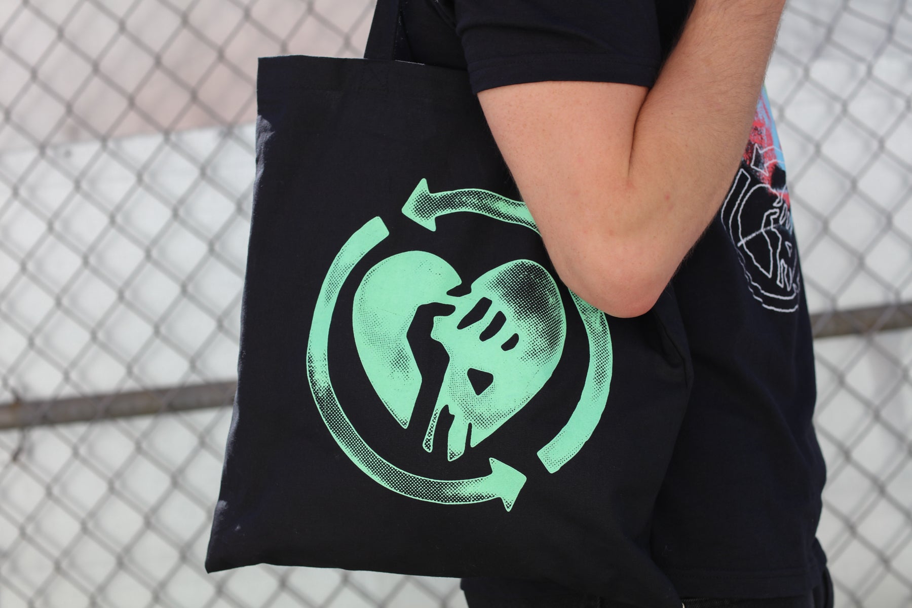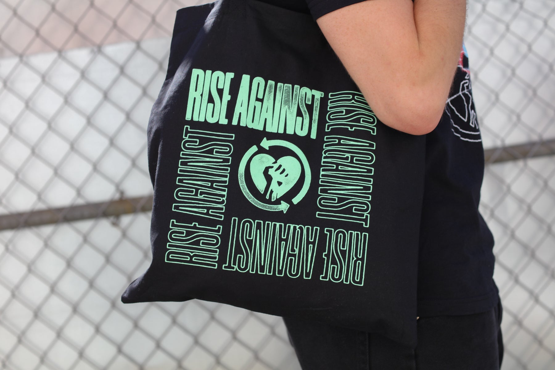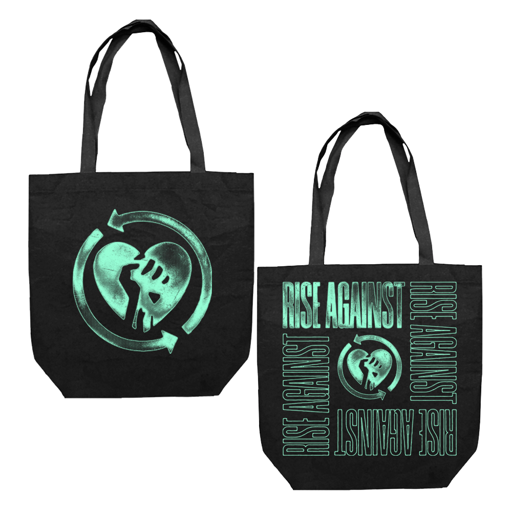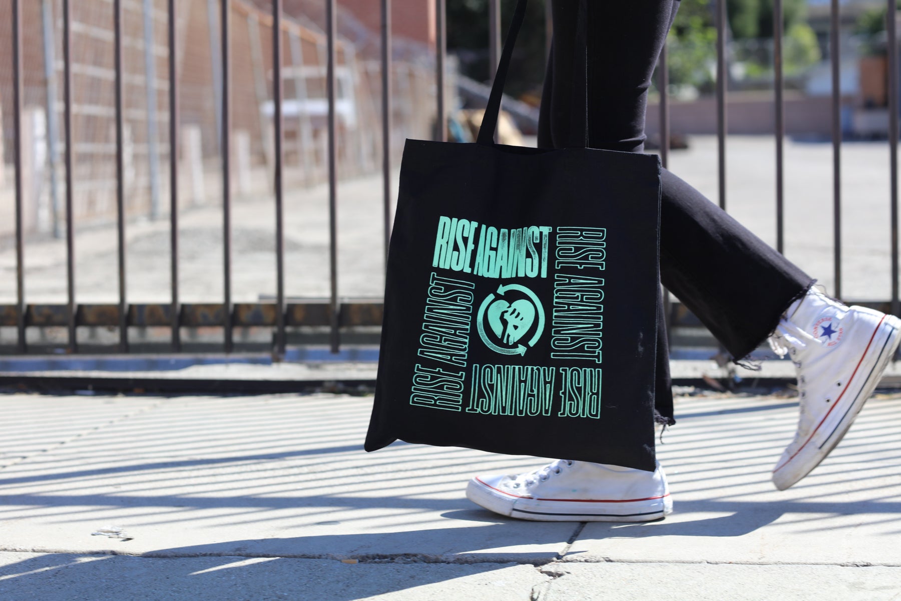 The Rise Against HeartFist Fade design, screen printed on a black canvas tote bag.