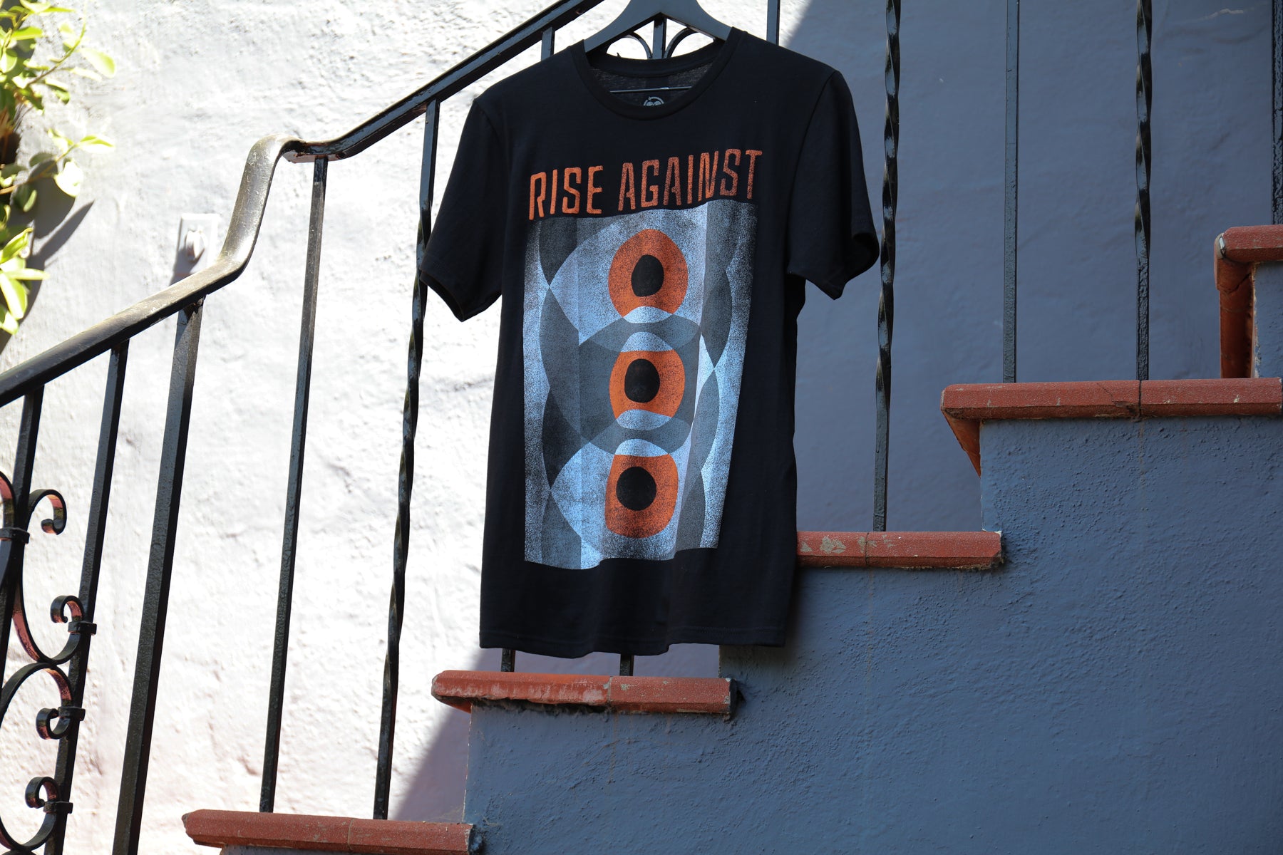 The Rise Against Marble Eyes design, printed on a comfortable, standard-fitting black t-shirt.